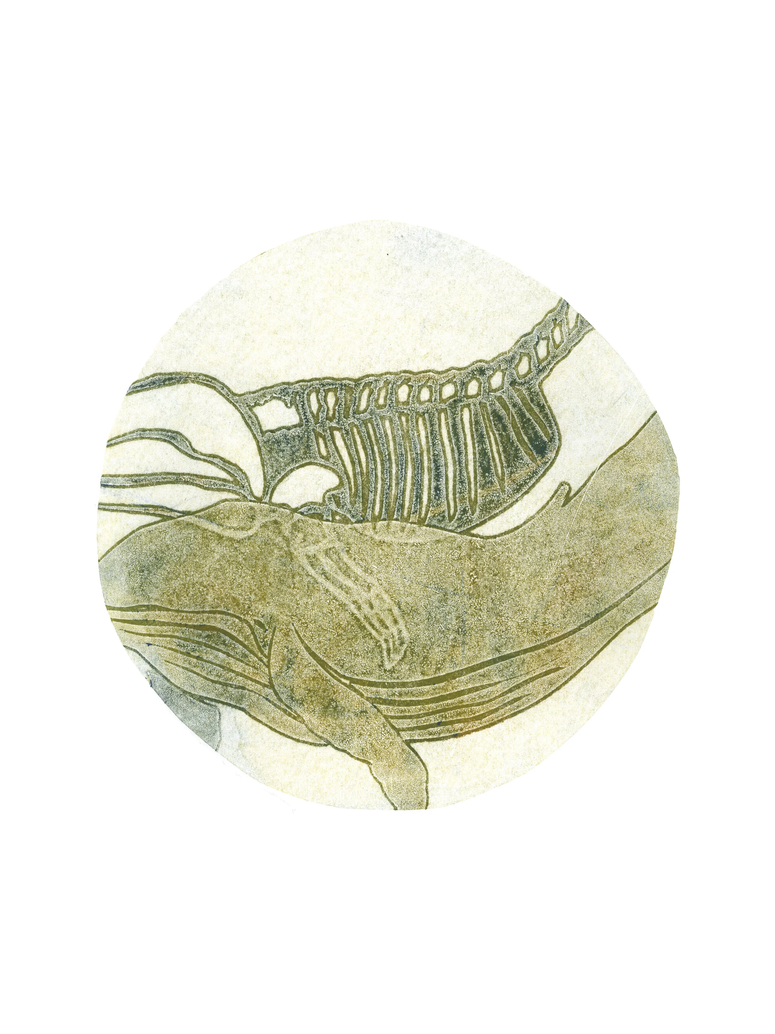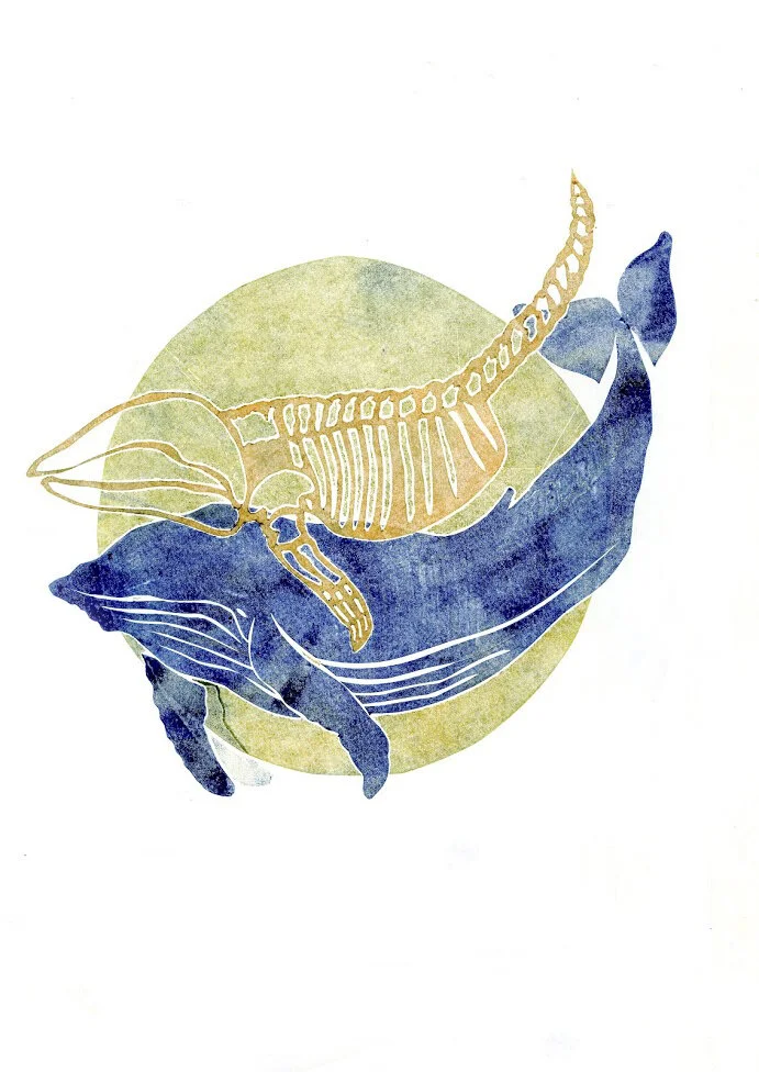 / based on a short story written by myself about a mysterious golden set of whale bones that reincarnate into the protector of the ocean. this series of prints were accompanied with a bone sculpture and felt whale (both sold). proceeds were donated to Oceana.